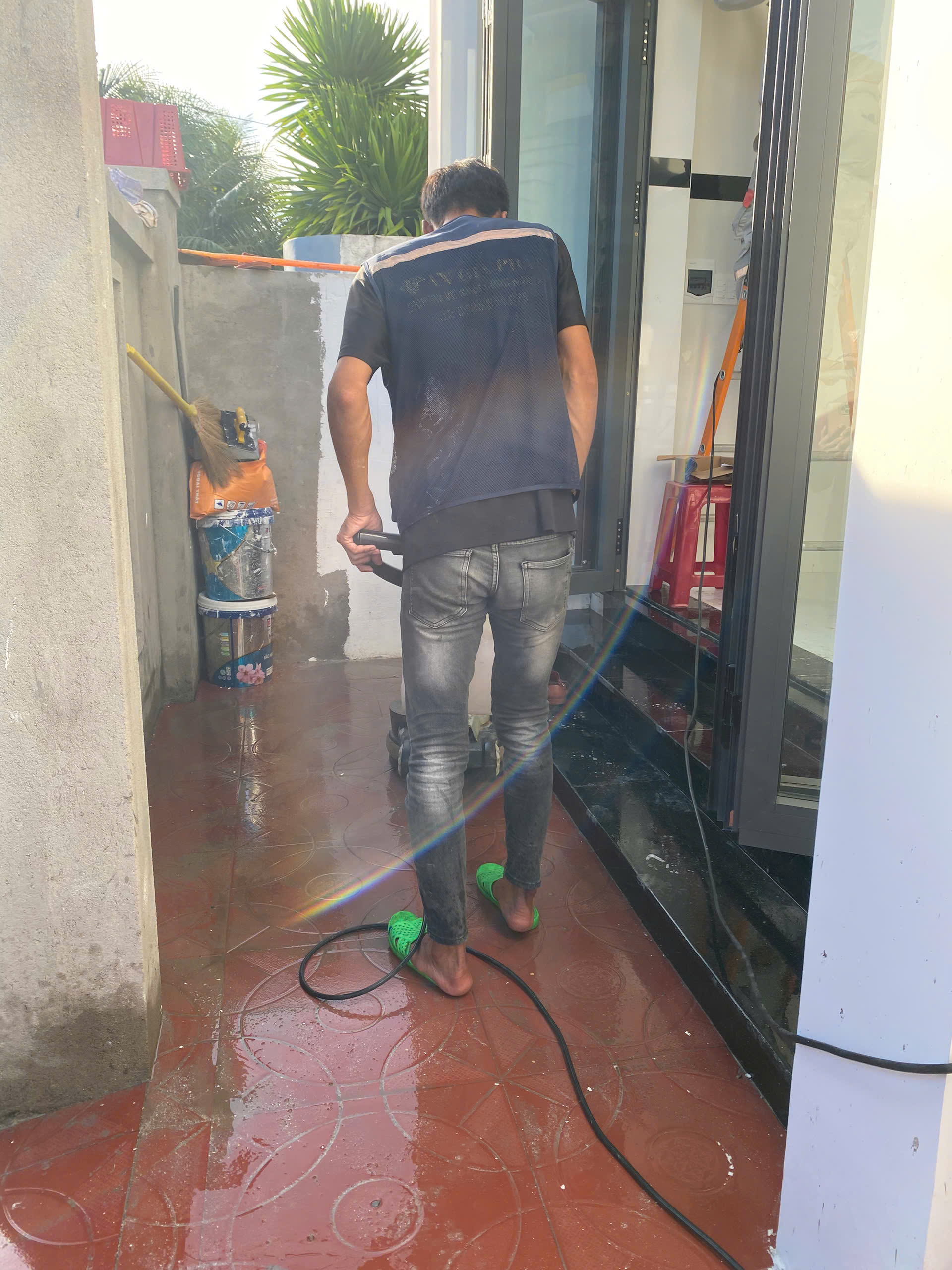 - Chuẩn bị mặt bằng: Di dời/che phủ đồ đạc & máy móc, quét – hút bụi thô, xử lý len tường.