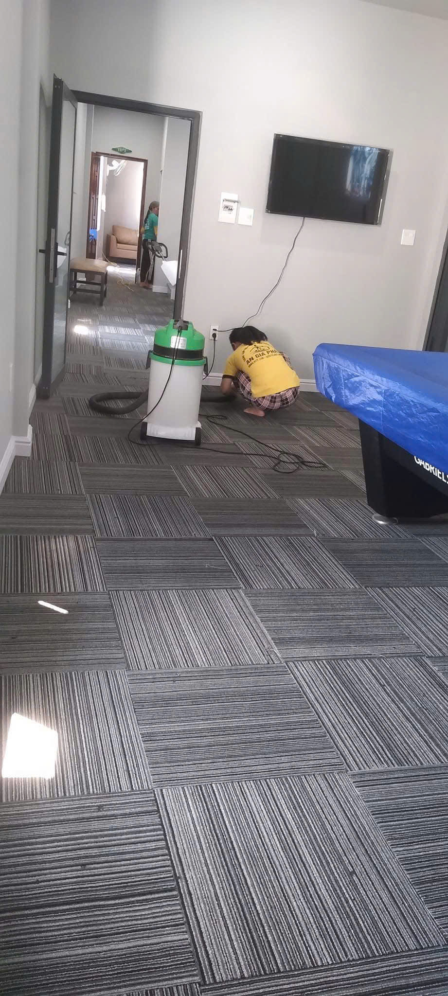 - Phun dung dịch chuyên dụng: Phủ đều để dung dịch thẩm thấu sợi thảm.